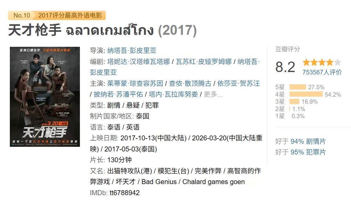 口碑层面,《天才枪手》完了了环球范围内的全面封神。豆瓣评分雄厚在8.2分附近,是昔时评分最高的外语片之一;北好意思烂番茄崭新度达100%,爆米花指数高达95%,IMDb评分也雄厚在8.3分,收货环球影评东谈主一致好评。