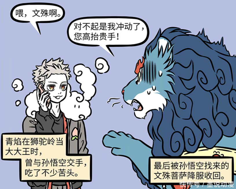 其实很简便,独一孙悟空打电话给文殊菩萨,青焰就会被拿持。青焰求孙悟空手下包涵,刚才是它冲动了。当初在狮驼岭,青焰照旧大大王,也曾与孙悟空交手,亦然吃了不少苦头。临了青焰是被文殊菩萨战胜收回,还是老诚一千多年的手艺。