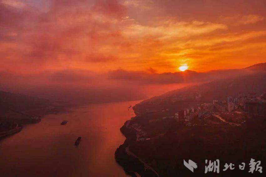 顷然,瞟见东面云层透出浅金色的光晕,像有东说念主打翻了蜜罐,将天边的云絮染成蜜糖色。隆盛的形态无以言表,长江三峡披上皑皑的细纱,红霞如飘扬的丝绸层层铺展,一艘艘游轮像花朵穿梭其间。