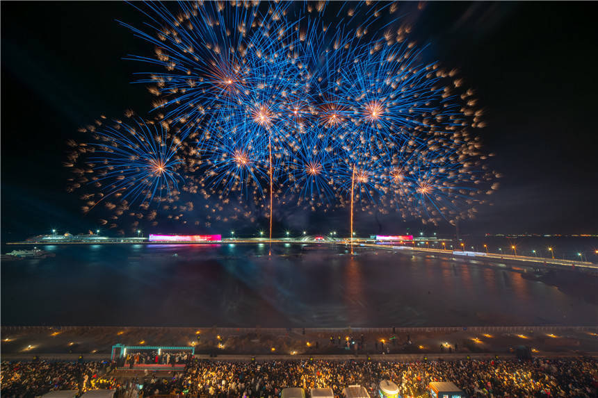 上海新年第一游暨上海海外邮轮旅游度假区跨年迎新系列活动于2025年12月31日晚启幕,吴淞口空中戏院烟花大秀惊艳登场,将跨大除夜氛围推向燥热过火。宝山区新闻办供图