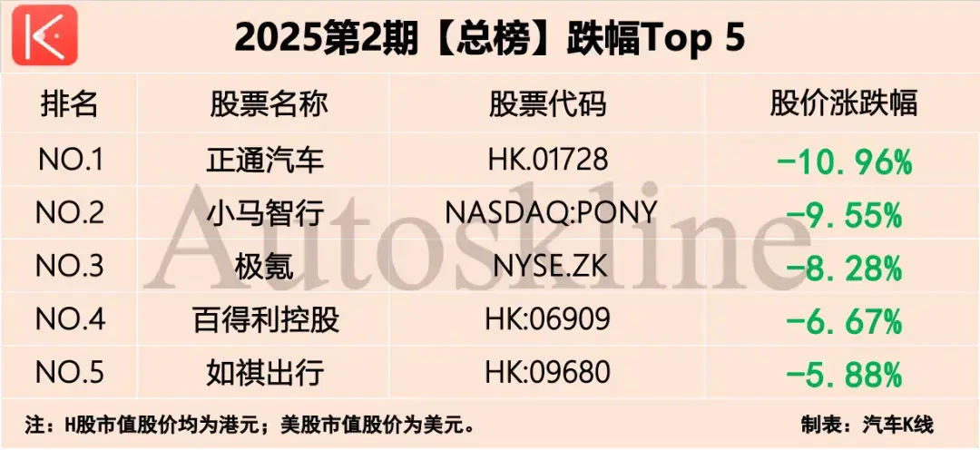 跌幅方面,领跌的雷同出自经销商/零卖板块,即正通汽车着落10.96%,亦然唯独跌幅进步10%的个股,其次小马智行、极氪、百得利控股、如祺出行和极星汽车,跌幅进步5%。