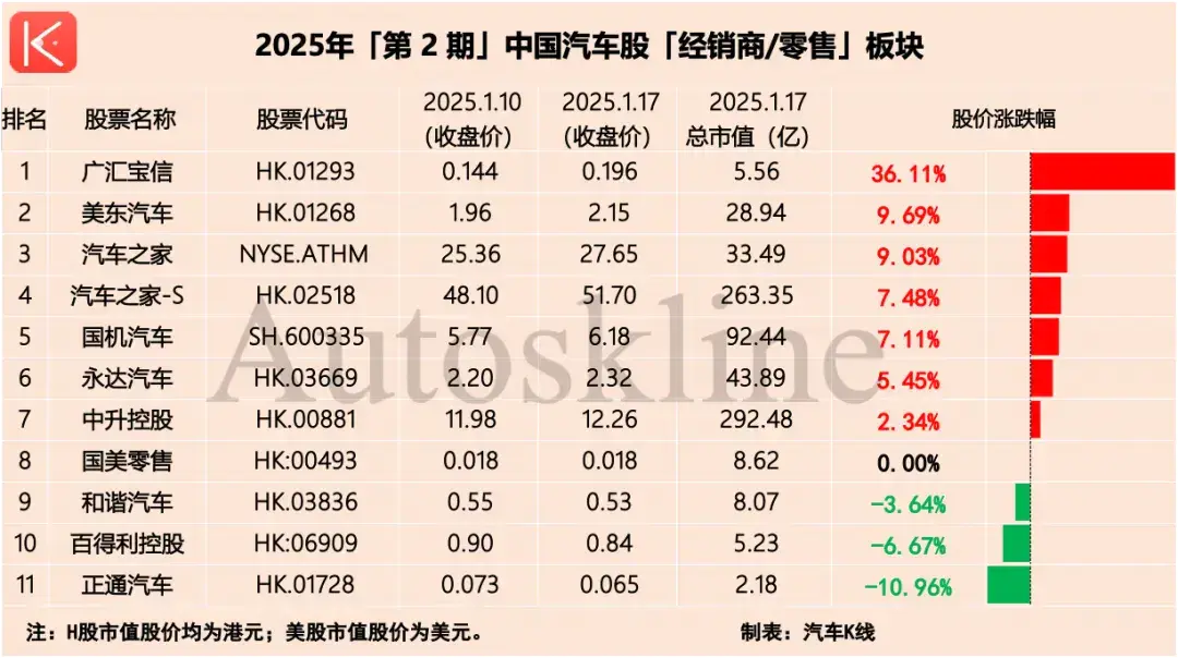 跌幅方面,唯有正通汽车、百得利控股、和谐汽车翻绿。其中正通汽车1月15日刷新52周最低0.056港元/股。不外,1月20日放弃发稿,正通汽车大涨40%。