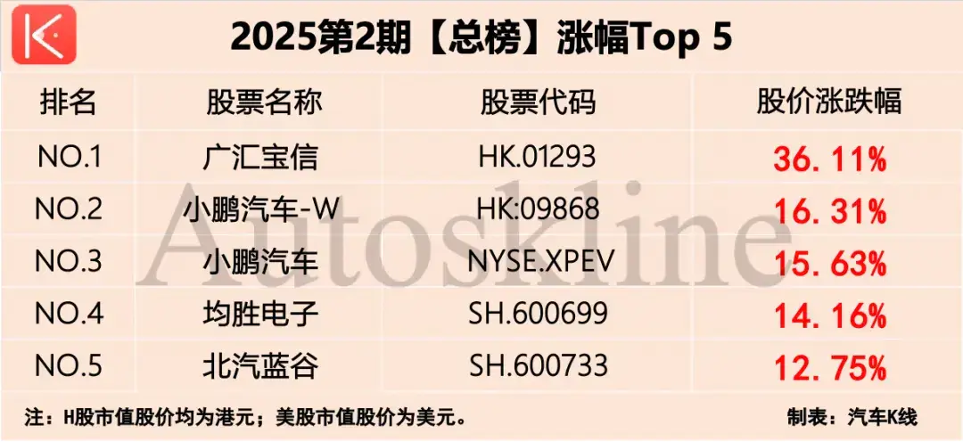 从总榜来看,广汇宝信以36.11%涨幅领跑,其次小鹏汽车双股飞腾进步15%;同期均胜电子、北汽蓝谷、雅化集团、零跑汽车涨幅进步10%,位居前方。