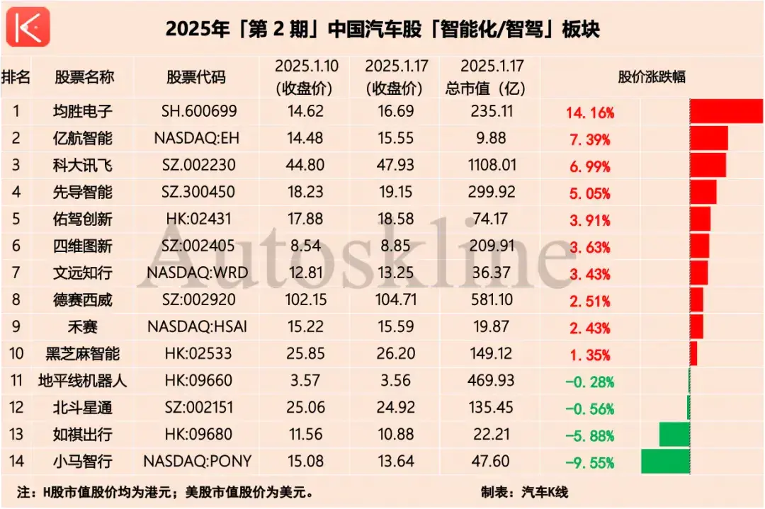 本期智能化/智驾板块股价平均飞腾2.47%,雷同翻红个股占大都。其中均胜电子飞腾14.16%领涨,亿航智能、科大讯飞、先导智能,涨幅均进步5%。