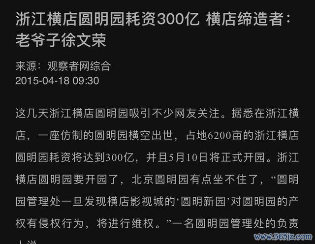 《浙江横店圆明园破耗300亿 横店创建东说念主:徐文荣老爷子》