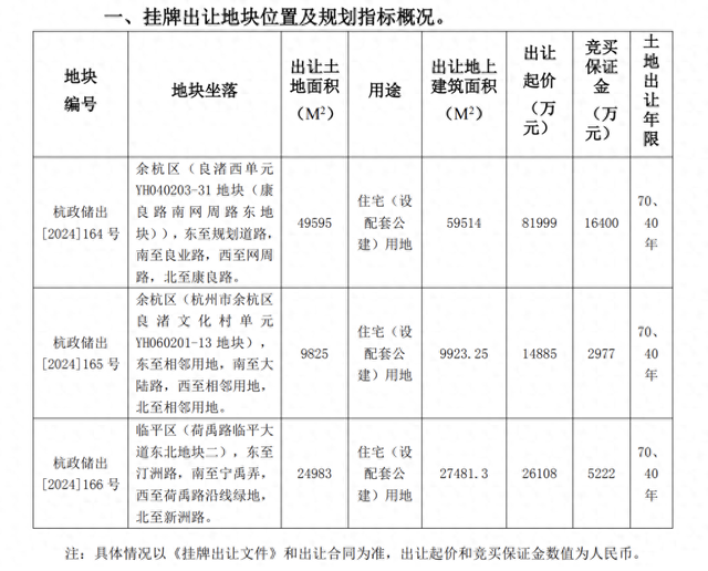3宗地块中,出让肇端价最高的地块为杭政储出[2024]164号地块,即余杭区良渚西单位YH040203-31地块(康良路南网周路东地块),该地块东至策划谈路,南至良业路,西至网周路,北至康良路。地块出让地盘面积为49595简单米,出让地上建筑面积为59514简单米,出让肇端价为81999万元,折合肇端楼面价13778元/简单米。该地块用途为住宅(设配套公建)用地。