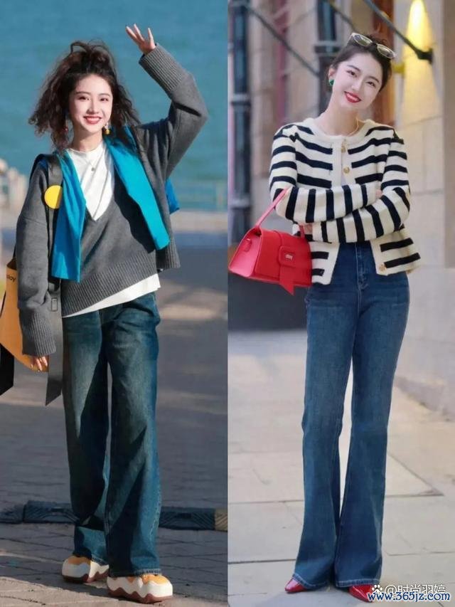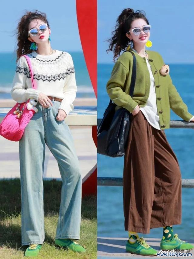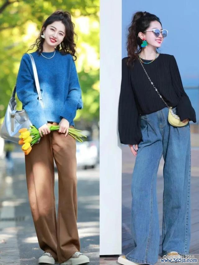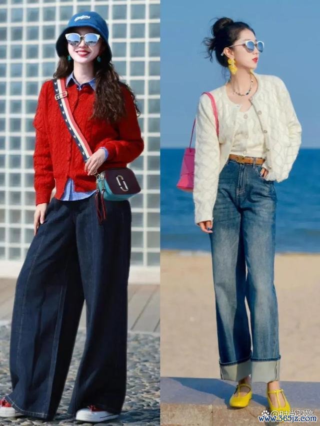 如果身体有所走样,有胯宽腿粗或者是小肚腩,不错模仿左边的这一套,用红色的诚笃开衫内加一件蓝色的衬衫,酿成一个访佛的穿搭姿首,下半身遴荐蓝色的牛仔阔腿裤,脚上踩着一对红色的帆布鞋,这么的穿衣配色很经典,档次感分明,况兼这肉显瘦。