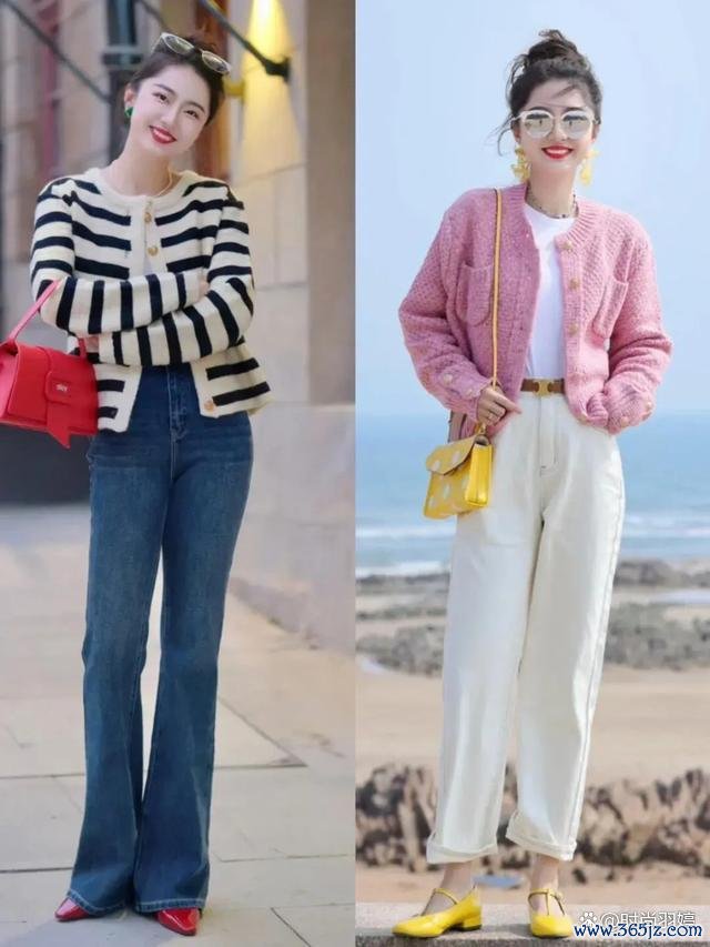 如果是小个子女生,右边的这一套会更允洽,给与了短款的白色诚笃开衫,搭配上牛仔直筒裤,脚上踩了一对圆头的琴口单鞋,这么的穿衣造型属于上短下长的搭配方式,更好的优化身体比例。
