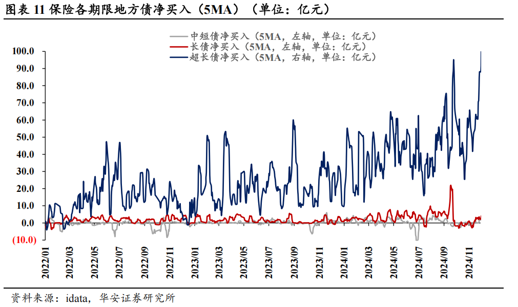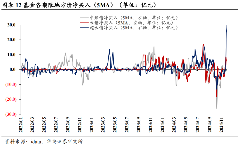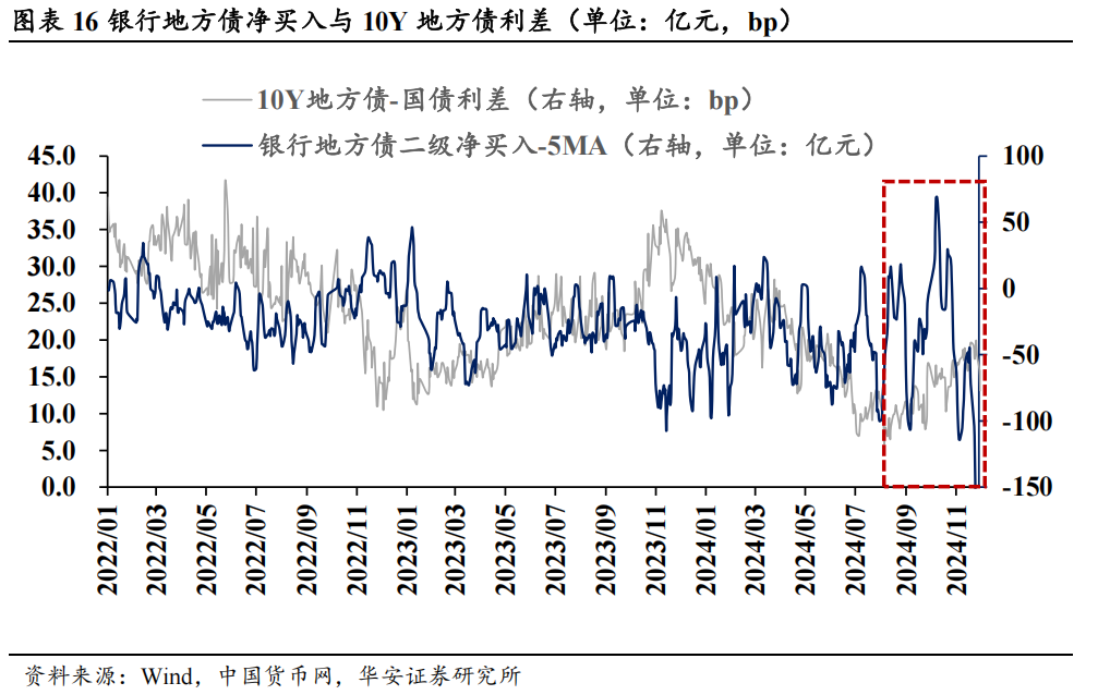 ⚫ 从买入卖出时点来看,银行的净买入和场地债供给呈略略滞后的反向变动。9月以来,银行承神勇量趋于饱和,重复年末行情,在二级商场买短卖长。供给大幅增多时,银行在一级商场被迫贯串,随后在二级商场大幅卖出。2024年9月以来,场地债刊行提速,尤其是在化债布景下,场地债置换的期限不断拉长,银行的一级承神勇量接近饱和。为了均衡久期风险,银行在二级商场买短卖长。11月以来的年末行情中,为了相宜久期监管要求,银行进一步卖出长债。