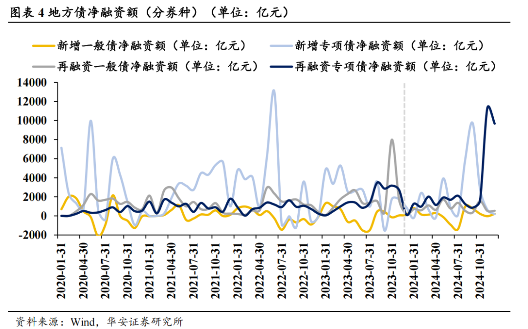 再融资专项债占比50%以上,较往年大幅普及。2024年场地债净融资累计6.8万亿元,其中新增一般债0.12万亿元,新增专项债2.69万亿元,再融资一般债1.04万亿元,再融资专项债3.57万亿元。再融资专项债占全年比例为52.5%,而往年占比仅为20%-30%,该比例的大幅普及主要与10万亿化债决策不竭鞭策、场地债到期岑岭驾临揣度。