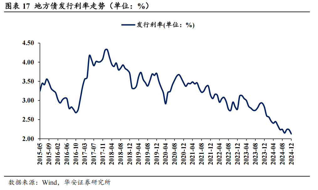从合座上来看,场地债刊行票面利率从2018年起呈现下行趋势。适度12月27日,2024年12月场地债刊行票面利率为2.13%,相较于2018年2月的4.32%,下降了2.19%。