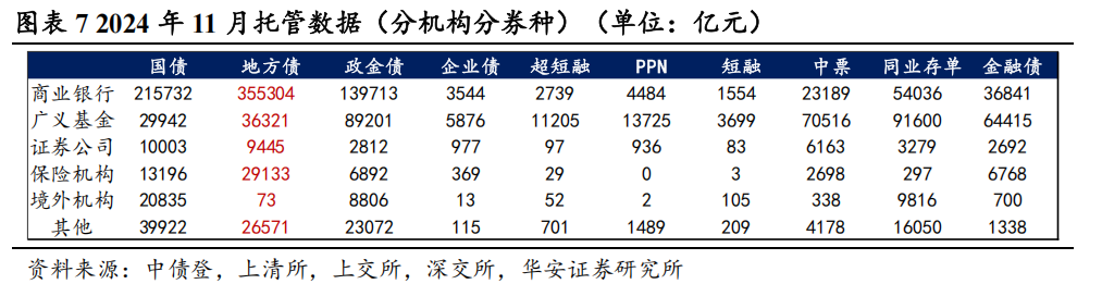 从存量托管数据来看,银行、基金、保障是场地政府债果真立主力。适度2024年11月,贸易银行的场地债托管量为35.53万亿元,广义基金的场地债托管量为3.63万亿元,保障机构的场地债托管量为2.91万亿元,从往期及最新托管数据来看,银行、基金和保障是场地政府债果真立主力。