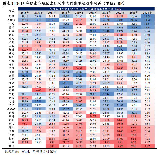 分地区来看,跟着场地债刊行商场化程度提高,各地区场地债刊行利差趋于分化,经济发达地区场地债刊行利差合座较低。从2015-2024年这十年间合座来看,内蒙古、吉林、黑龙江、宁夏等地区刊行利差较高,峰值出目下2017-2018年,利差高达50BP以上,2017年内蒙古更是达到了最岑岭61.26BP;而上海、深圳、浙江、北京等地区刊行利差较低,平均在15BP傍边。从近期数据来看,2024年各地区刊行利差进一步下降,唯有天津、内蒙古、江西、贵州四个地区的刊行利差仍然在10BP以上,其余步区刊行利差均在10BP以下,最低的深圳仍是降至1.87BP。