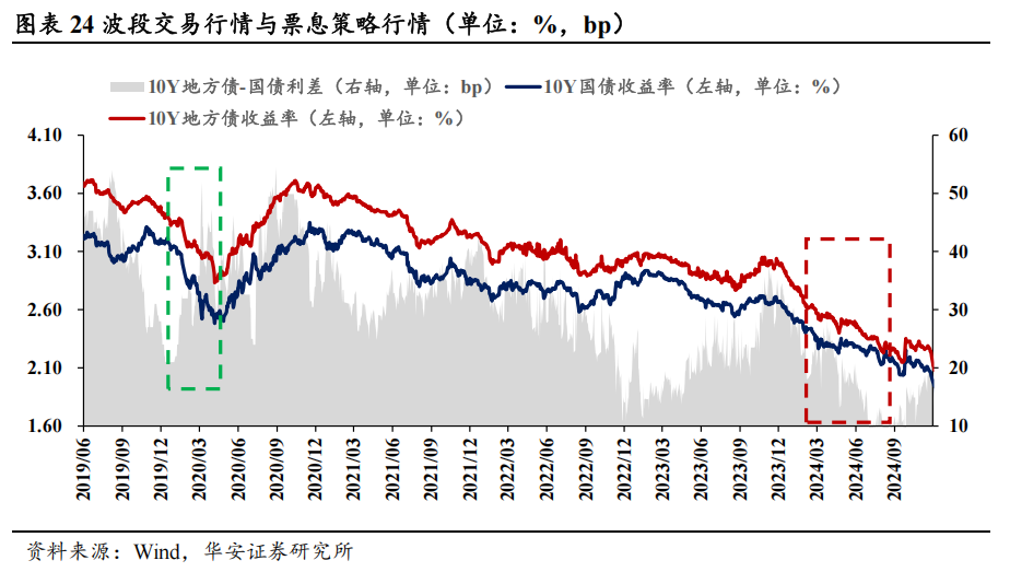 (2)如前所述,场地政府债的一大特色是低流动性,在供给潮中能赢得更高的流动性溢价;另一大特色则是高票息,渊博投资者持票息策略时拥堵度更高,渊博投资者持波段交游策略时则拥堵度裁汰。钞票荒时,高收益钞票难寻,投资者不时接管高票息策略,追求安靖现款流,场地债需求由此情随事迁,助推场地债利率裁汰、利差走窄,举例2024年来票息策略极致演绎,利差不竭下降;相背,在触动市中,波段交游策略更受投资者负责,投资偏好转向流动性更高、票息更低的国债,如2020年债市在牛市中出现屡次快速反弹和调遣,演绎快牛行情,国债更适于捕捉商场波动契机,利差由此走阔。