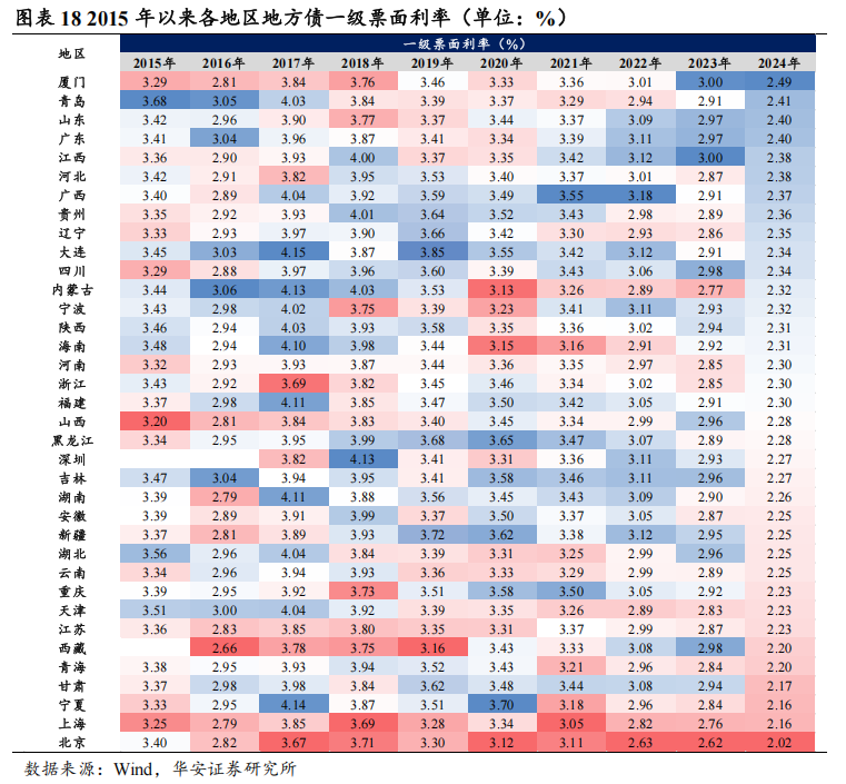 分地区来看,场地债刊行票面利率的地区各异显贵,从2015-2024年这十年间合座来看,票面利率较高的地区频繁为经济发展相对滞后或者财政情景较为焦躁的区域,而经济较发达或财政实力较强的地区票面利率相对较低。从图表来看,广西、黑龙江、吉林等地区的票面利率相对较高,平均在3.30%以上;而北京、上海、江苏、浙江等地的平均票面利率较低,平均在3.10%傍边。从近期数据来看,2024年各地区场地债票面利率进一步下降,最高不进步2.5%,北京致使降至2.02%。