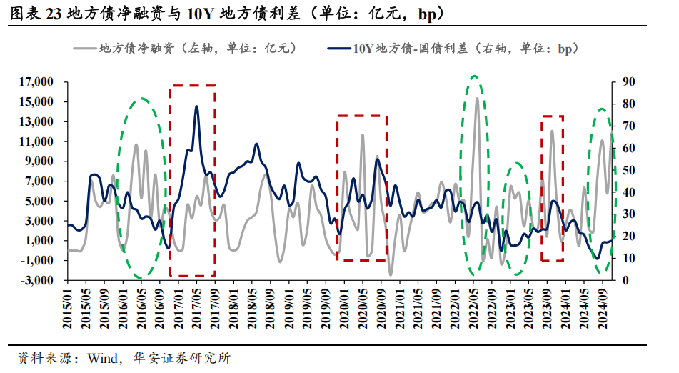 钞票荒形势突显时,商场需求充足,对供给冲击酿成副作用,推动利差保管致使走窄。钞票荒深度演绎下,优质钞票稀缺,商场需求满盈贯串新发的场地债,供给压力导致的流动性溢价一定程度上被减轻。如2024年11月以来化债落地加速,场地债净融资大幅增多,利差却并未走阔,原因在于2024年以来钞票荒形势不竭。2022年上半年、2023年上半年的钞票荒中,净融资增多并未随同利差走阔,亦然出于换取的原因。