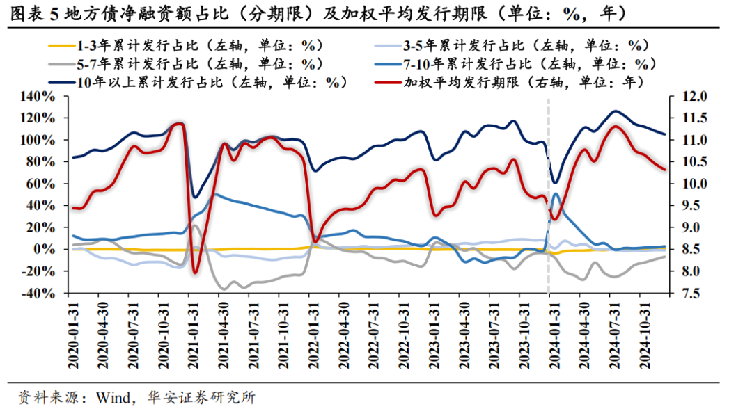 2024年场地债加权平均刊行期限同比提高,主要与10年以上期限占比提高揣度,进一步细分来看,主要原因是再融资专项债的10年以上期限占比显贵提高。2024年上半年加权平均刊行期限(各期限左区间乘以累计刊行量占比后乞降,下同)为11.0年,同比提高7.3%,全年加权平均刊行期限为10.32年,同比提高6.4%。平均刊行期限的提高,主要与10年以上期限占比提高揣度。进一步分券种看,主要与再融资专项债10年以上期限占比显贵提高揣度,年末新发的2亿元再融资专项债中,10年以上的债券净融资额高达1.84万亿元。