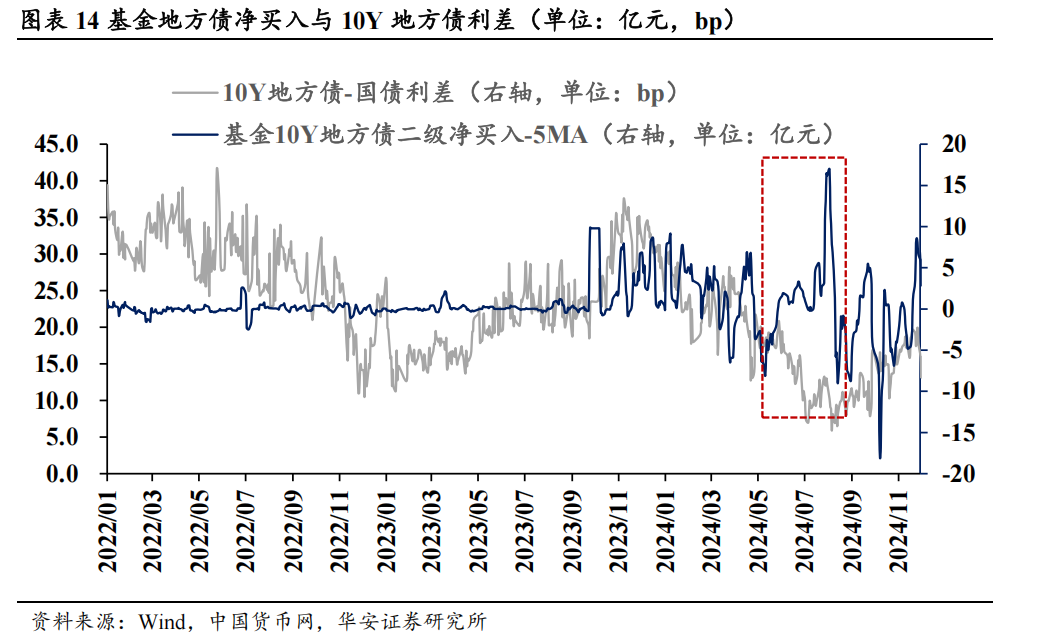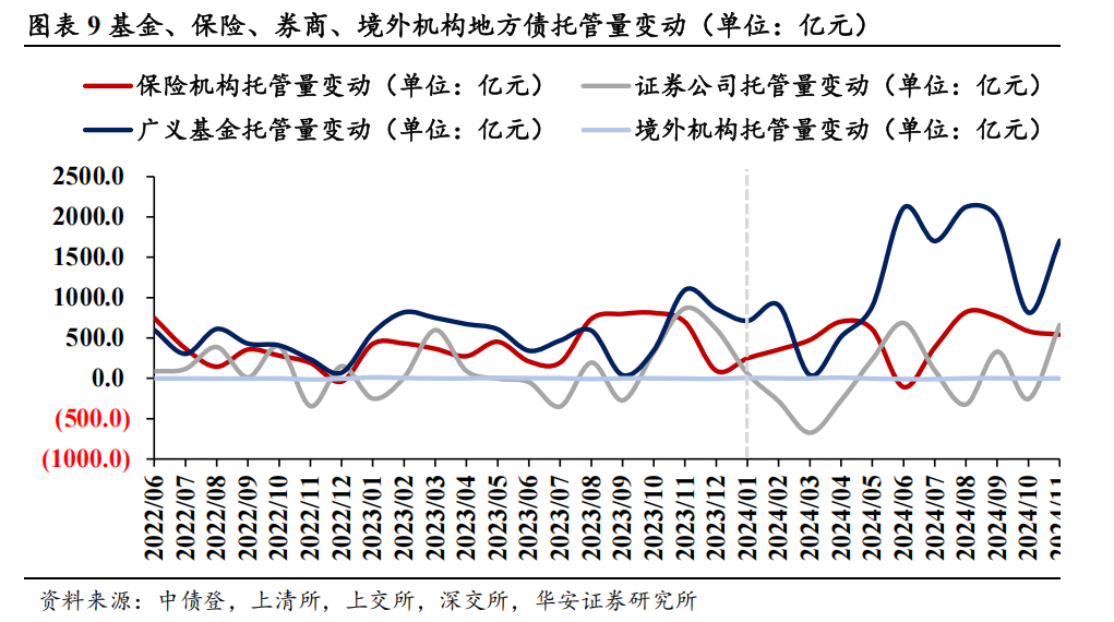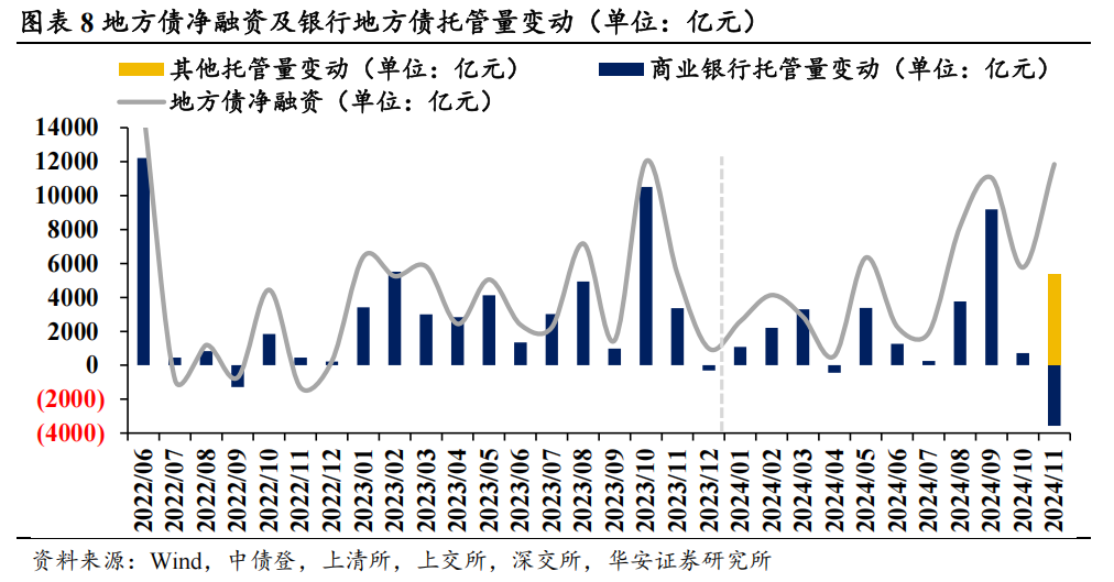 从托管数据变动来看,银行的场地债托管量变动与场地债净融资额高度一致。出于撑持财政发力、爱戴与场地政府的关系等野心,场地债大幅放量时,银行在一级商场被迫贯串,发达为场地债托管量与净融资额同期增多。如2024年9月,新增专项债大幅放量使得净融资额抬升,银行托管量险些同比例增多。2024年11月银行托管量与净融钞票生背离,原因是央行买断式逆回购使得托管数据不再能信得过反应银行的配债活动,从其他类机构的托管量还原银行信得过配债需求后,11月银行增持场地债1782亿元,与净融资变动趋势重回一致。此外,在历次场地债放量时,基金的场地债托管量也有小幅普及。