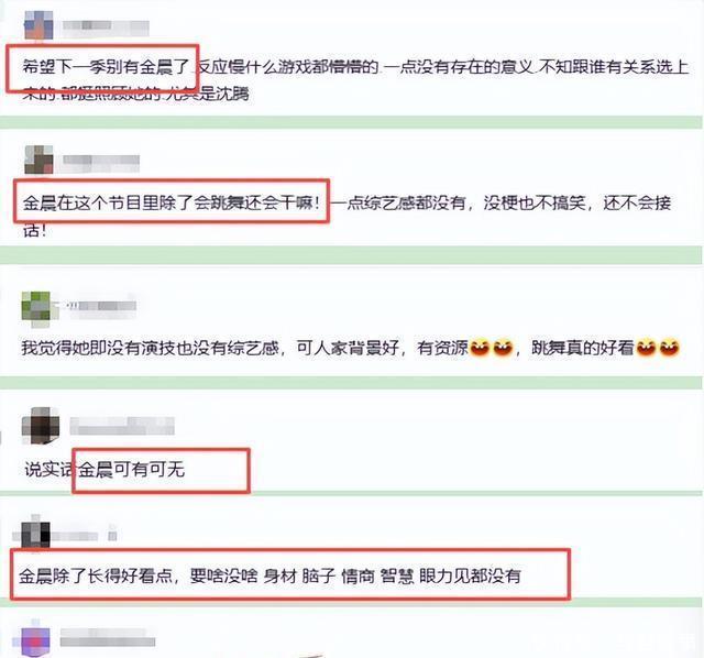 难怪网友暗示,下一季金晨别来了,响应慢、玩啥游戏都是懵懵的,少量存在感都莫得,没梗也不搞笑。 还有的暗示,金晨唯独跳舞能拿脱手了,脑子、身段、情商和目力见都莫得。