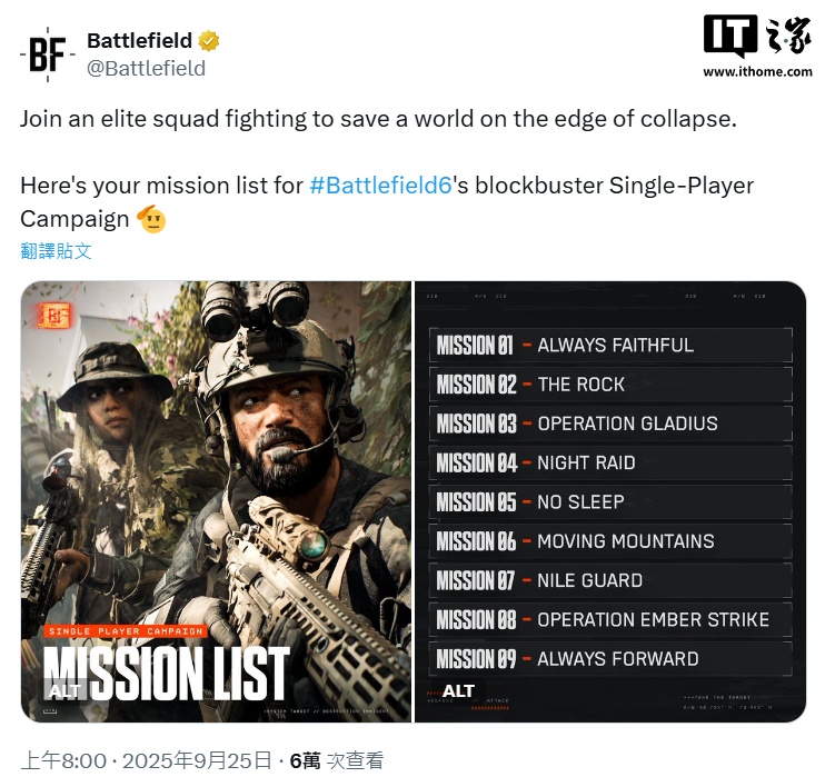IT之家 9 月 25 日音讯,战地使命室今天在 X 平台公布了《战地 6》游戏的单东说念主战争步地任务清单。