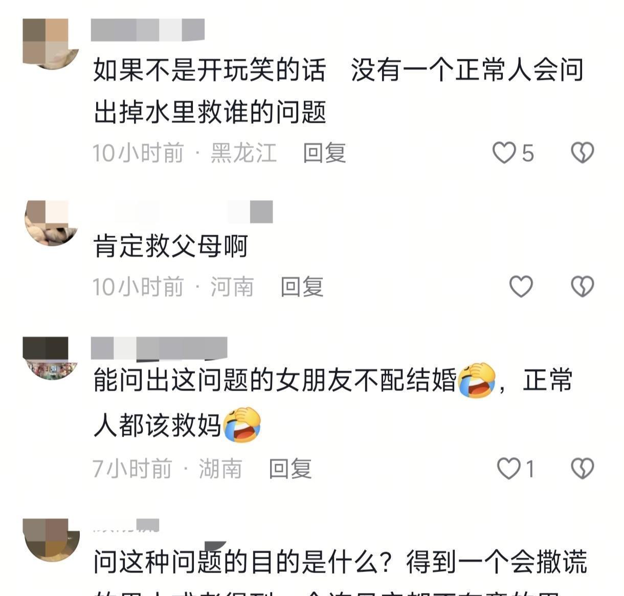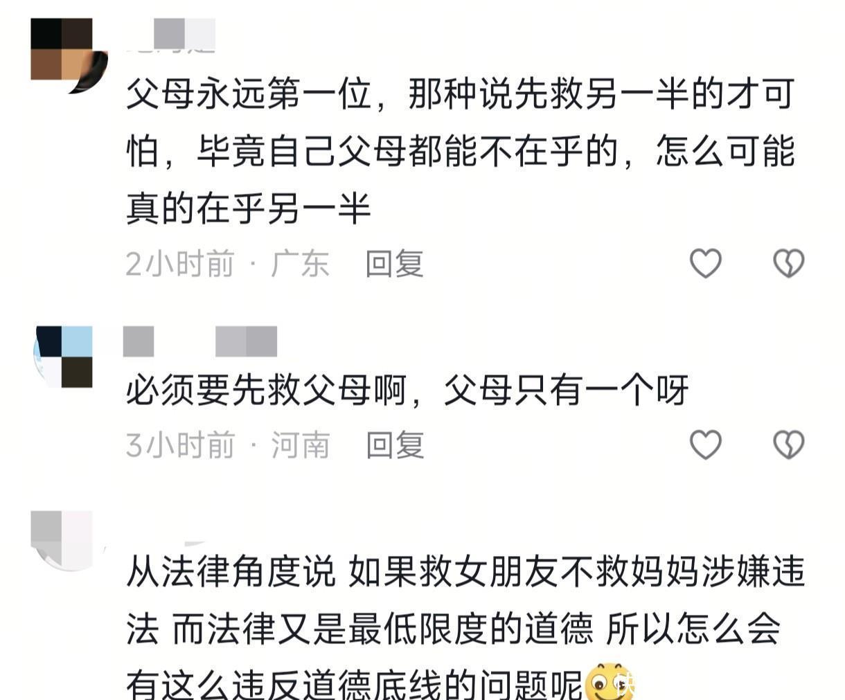 一位网友说,父母永恒是第一位的,一个男东说念主若是连他妈齐不救,说先救你,你能信吗?