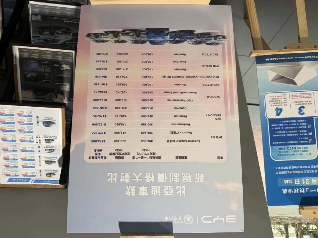 在比亚迪门店内,一家三口正照拂SUV(通顺型多用途汽车)车型,并对Atto3展示出趣味,随后切体格验了驾驶及后排乘坐空间。店内海报骄贵,比亚迪位居2025年香港地区电动汽车销量榜首。还有海报展示了“一换一”霸术下,购买不同车型可免缴的税费。具体来看,ATTO 2车型售价最低,在免缴7.33万港元税费后,售价15.50万港元;M6 Superior Captain(6座版)售价最高,在免缴17.25万税费后,售价30.69万港元。