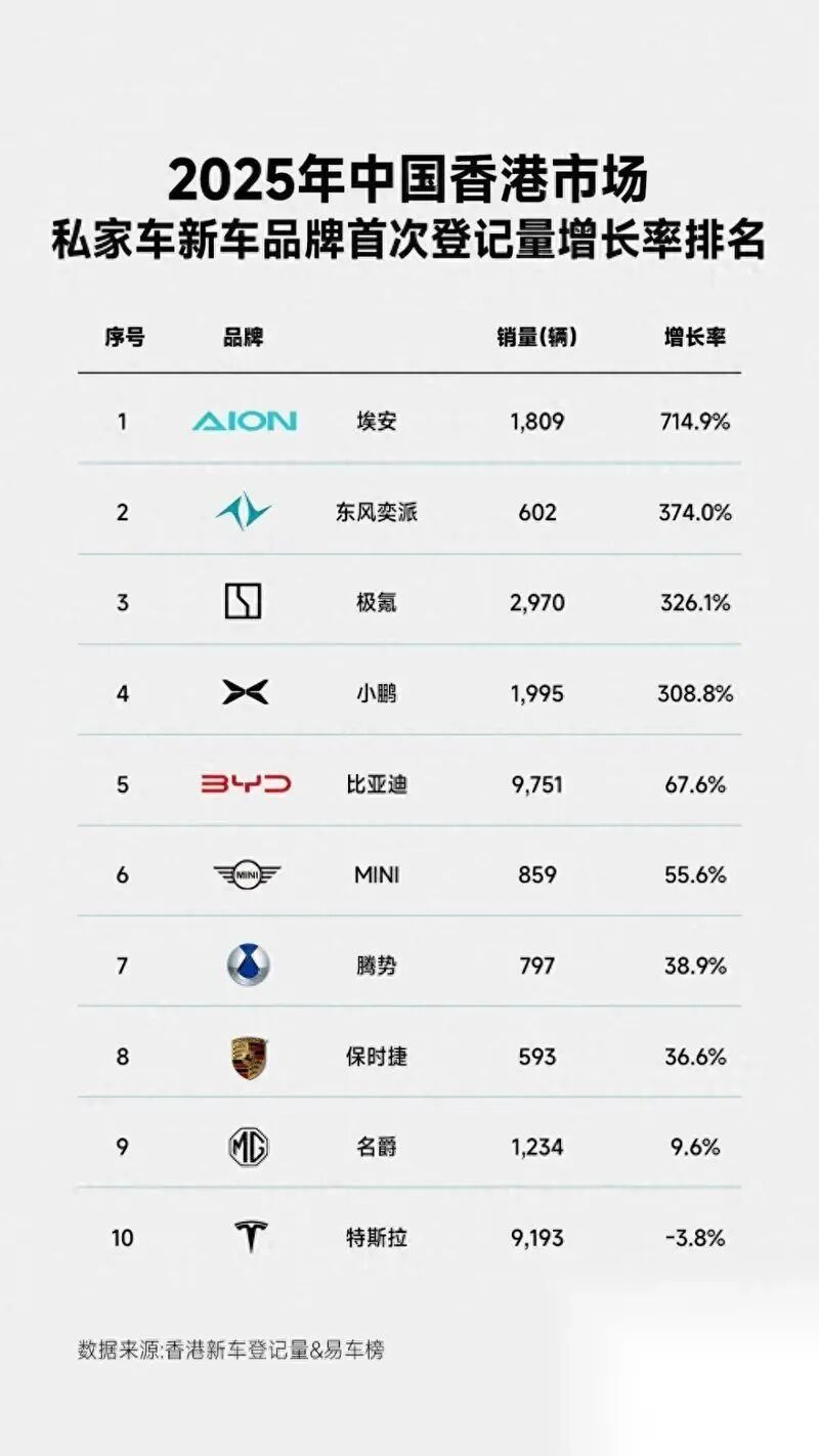 统计数据骄贵,2025年香港市集私家车新车品牌初度登记量增长率前10名中,有7家为国产新动力车企,别离为埃安、东风奕派、极氪、小鹏、比亚迪、腾势、名爵。香港输送署数据则骄贵,2025年,比亚迪以9751辆的新车登记量向上特斯拉,初度成为香港全品牌销量冠军;同期,比亚迪海狮07EV以5680辆的收获,成为香港年度最畅销车型。