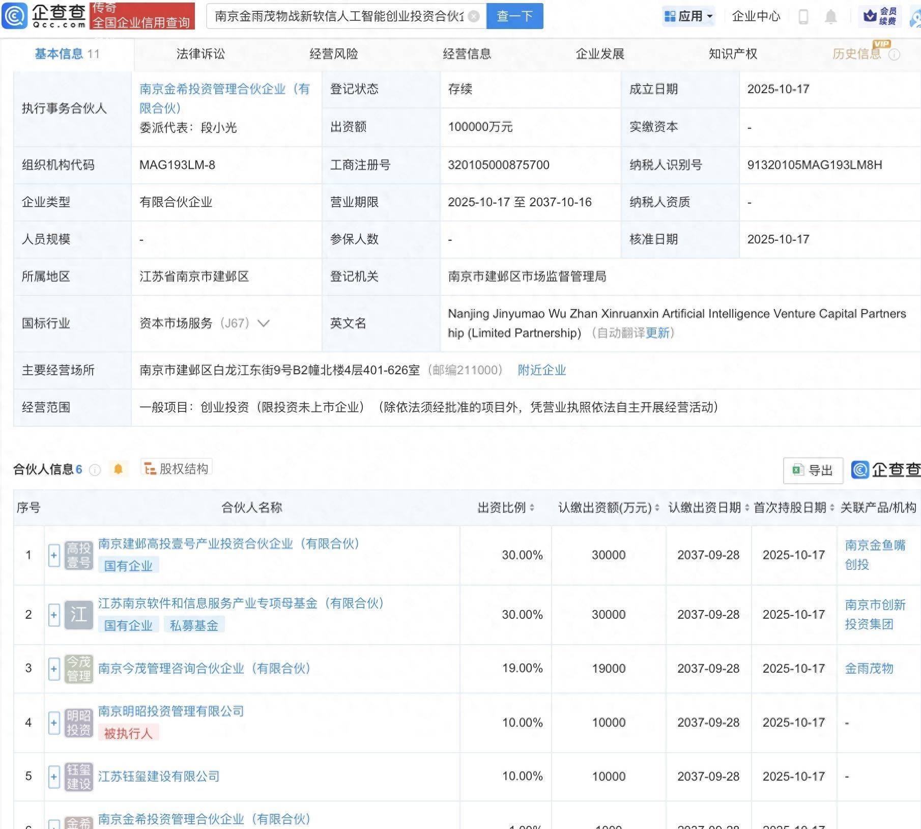 企查查APP泄露,近日,南京金雨茂物战新软信东谈主工智能创业投资合资企业(有限合资)树立,出资额10亿东谈主民币,主义范畴为创业投资。企查查股权穿透泄露,该企业由江苏南京软件和信息管事产业专项母基金(有限合资)等共同出资。